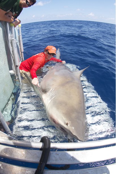 When he and his team catch one, they outfit the shark with either a satellite tag or an ID tag, take tiny samples of muscle and fin and a vial’s worth of blood (they check to see if the shark is pregnant), then send the shark on its way. The whole process takes about five minutes.