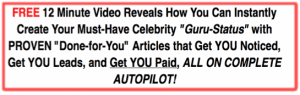 FREE 12 Minute Video Reveals How You Can Instantly Create Your Must-Have Celebrity “Guru-Status” with PROVEN “Done-for-You” Articles that Get YOU Noticed, Get YOU Leads, and Get YOU Paid, ALL ON COMPLETE AUTOPILOT!