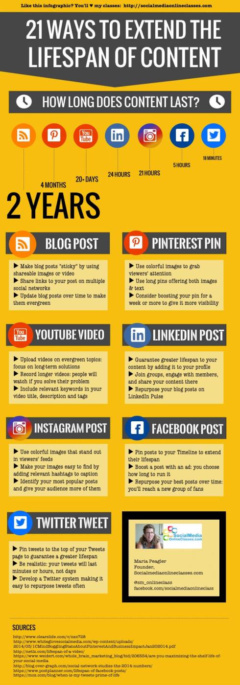 21 Ways to Extend the Lifespan of Content is a great, concise infographic. Put this to use asap and I bet results will be rapid.